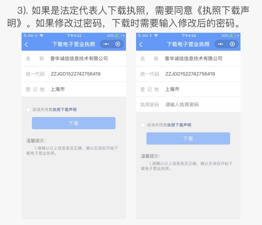 企业的法定代表人是电子营业执照的默认领取人。手机版电子营业执照的首次领取只能由企业法定代表人通过手机等移动端完成。企业法定代表人领取手机版电子营业执照后,可自行或授权证件管理人员保管,持有,使用电子营业执照。企业法定代表人或者证件管理人员可授权办事人持电子营业执照办理相关的政务,商务,公共服务等业务。证照管理员和办事人经过授权后,可下载电子营业执照并使用。企业对于电子营业执照管理和授权使用的合法性,真实性,合理性等负责。