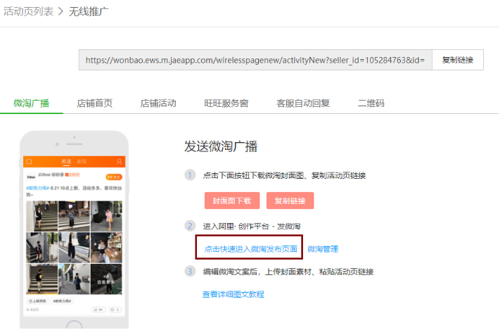 B.选择发送微淘广播,将活动信息发布到微淘中。