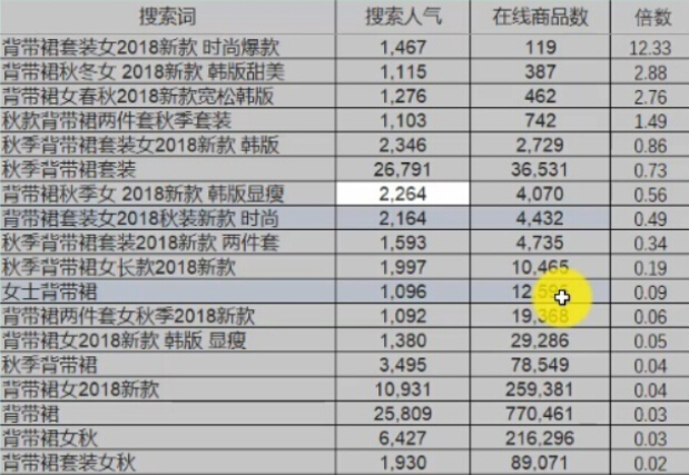 经过几次的筛选之后,会遇到这种一种情况,我们在写标题的时候往往会发现,对于一些搜索人气和关键词倍数特别好的词语,会发现这些词语字数特别多,整体看上去特别长,像“背带裙套装女2018新款 时尚爆款”这类词语,这类词是淘宝系统根据大家的检索习惯来推荐的,并不一定是客户主动搜索的,所以其实我们一般是不用的。