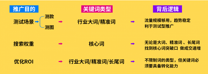 不同的应用场景下关键词选择是不同的。上诉按关键词的类型区分有大词,精准词,长尾词/飙升词。比方商家想实现通过直通车快速拉升搜索权重。