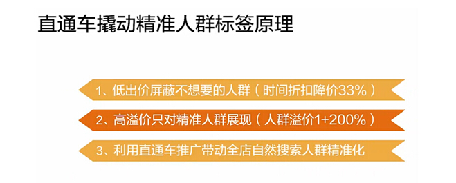 这句话怎么来理解呢?通过对标签做推广逐渐地以直通车为迁移,逐渐改变全店人群标签的精准化,从而撬动全店自然搜索人群标签。