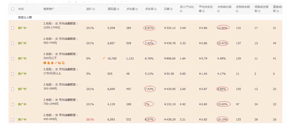 第二层测试时,又有一个明显的差距在。同时我们会发现,第二层测试时整体的数据要比第一层测试时表现要好很多。第一层平均转化率7%,而第二层整体的数据已经达到点击率7%以上,转化率在10%左右。这也恰恰说明了我们是在在第一层人群的精准之上再对第二层标签的筛选测试。数据奔跑后,也是500-1000的点击,会发现整个数据表现好的这部分会愈来愈趋向于精准。经过两层人群标签的测试达到我们预期想要的效果。然后对相对不够精准的这部分人群进行5%的降价,以达到屏蔽他们的作用,只对精准人群标签测试并且推广。经过一段时间之后,店铺以直通车为牵引,逐渐改变全店的精准化人群标签,以此撬动整个店铺的人群标签。