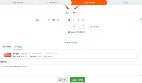 满减的金额一定要根据自己客单价和成本来计算!不要亏本!综合考虑客单价,天猫代运营这里设置的是满200-30。