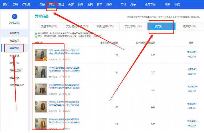 那怎么看店铺的宝贝这是滞销品,在这里我们点击生意参谋、品类、返回旧版、商品、异常商品,可以看到店铺零支付的那些宝贝。