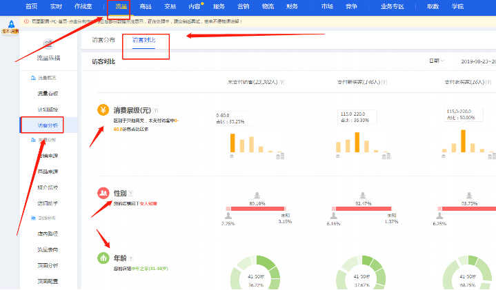 我们在生意参谋、流量、访客分析、访客对比里,在这里我们可以查看到店铺的人群标签,在店铺运营后期,活动推广的时候,我们也会针对性向这类人群推广,提高转化率。