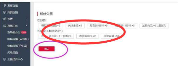 2、进入到粉丝分层的界面之后,主播用户可以看到很多相关的功能选项,这时候大家直接点击确认即可,如果觉得这些选项有很多不是自己想要的,那么主播用户是可以根据自己的需要去对相关选项进行点选的,点击下相关的就好了,选择好之后点击确定按钮,如下图: