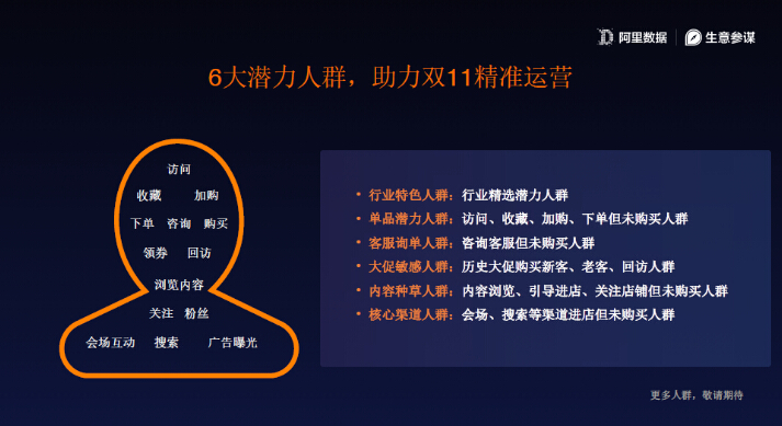 第四个功能是数据回流,现在能提供最长30天的转化效果,来告诉你这个人群到底怎么样,接着我们一个一个来看大家比较关心的问题,人群管理说的到底是哪些人群。