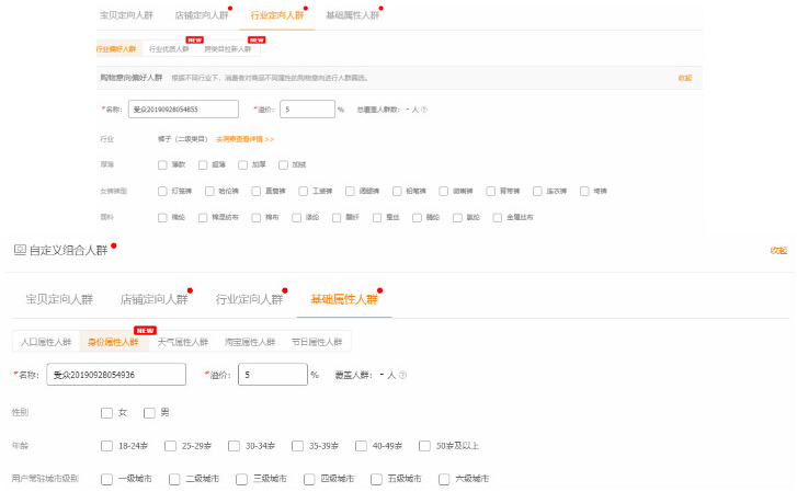 我们平常开精选人群,除了可以根据产品选取宝贝定向人群、店铺定向人群、行业定向人群、基础属性人群里系统给出的人群包的进行溢价测试之外,还可以根据产品属性,对购物意向人群以及基础属性人群进行圈定和测试