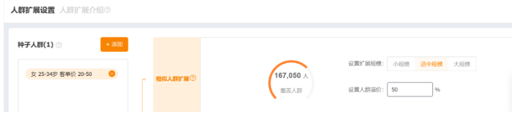 商家可选择部分效果较好的精选人群(智能拉新人群、喜欢店铺新品访客、喜欢相似宝贝访客、达摩盘人群、店铺高价值人群、天气人群除外)作为种子人群,通过寻找种子的相似人群,或是添加种子人群的热搜词来扩大种子人群的覆盖规模,来对人群进行测试。