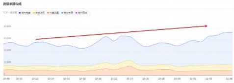 这个店铺是个C店,活动前虽然也在小幅度提升,但是并没有获得大的流量曝光。从活动开始以后,现在每天的流量基本都在喷泉式上涨,这点我很意外,上升的幅度确实很大,本来是在为双十二打基础的店铺可能要在双十一爆起来了。