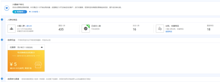 在我们的选择权益里面有个设置优惠券,我们可以通过设置优惠券让我们的意向人群进行回店从而进行购买。可以提高我们的一个店铺访客数同时也能提高我们的一个订单数。