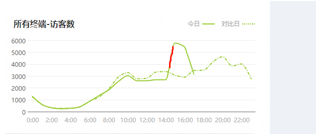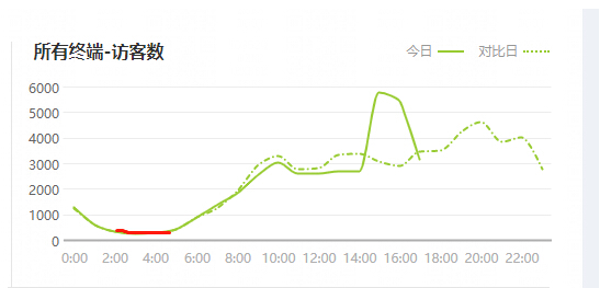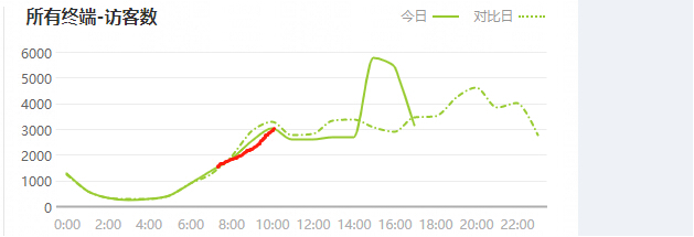 我们可以看到虚线是昨天的数据曲线图,实线是今天的实时曲线图,我们可以非常直观地进行对比,判断下一个时间段的流量趋势。