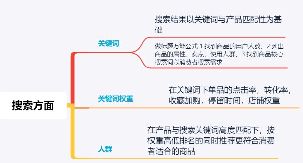 搜索流量是目前单品最主要的流量来源,而且精准度相对也是较高的,有需求才会有搜索,有点击才会有购买。那么在平台搜索机制下,当买家在搜索框检索商品的时候那么搜索结果优先展示的商品,它的规则是怎样的呢?由内到外,由广泛到精准,它必须要符合这几个条件,第一个关键词,搜索结果都是基于这个产品与这个关键词的匹配性高,第二个就是排名也就是关键词在搜索权重排名,第三个就人群精准匹配。简单的来讲就是搜索系统按关键词搜索需求选定商品范围,按照各个商品的权重来排名,在抓取排名时更多的是结合买家的人群属性推送更符合消费者的产品给到买家。