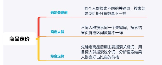 既然售价是商品的主要竞争力,那么我们就要把这尖端武器利用起来,成为你商品的在搜索上面的主要动力。在给商品的最终的一个定价,我们可以结合2个方面,一是人群,二是关键词,我们不同的人群搜索同一个关键词,或者同一个人群搜索不同的关键词,得出来的搜索结果价格区间的数量分布都是不一样的。同时我们为避免店内同类商品相互竞争内耗,可以利用关键词与价格措开来,先给产品定一个主要的关键词,这个词后期也就是这个商品的主要流量来源词,在用商品的目标人群搜索这个词,看系统推荐出来的主要价格段及人群购买占比,最终结合自己运营成本定出一个合适的价格