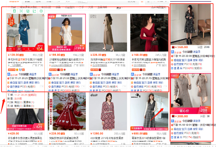 淘宝代运营来跟大家介绍下,开了直通车我们的商品将会哪里进行展示。直通车的展现位置在PC端的时候,在我们左侧首排带掌柜热卖的4个,还有我们右侧的掌柜热卖12个,还有我们底端的掌柜热卖5个,都是我们直通车的展现位置。