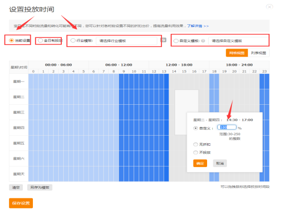 首先可以看到的是当前设置,即目前设置的分时折扣情况。可以在想设置时间段按住鼠标左键拖放,会弹出在这一个时间段理想设置的折扣,手动设置。 对于新手掌柜建议选择行业模板投放,这个是按照行业买家的购物特性时段进行投放。 同时对于有一定基础的掌柜,可以自定义模板,分析店铺实时数据流量及订单在哪一个时间段相对是高峰,从而针对这个时间段大力投放,从而提高店铺流量和订单。