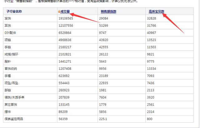 通过这个表格我们一目了然可以看出来,发饰是销量最高的,其次是耳饰,然后是diy配饰,当我们再去做饰品的时候是不是优先选择这些类目来做呢?不一定,对不对,为什么,因为除了销量这个因素之外,淘宝代运营还有竞争度,接下来我们再来看一组数据