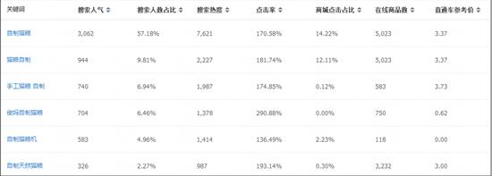 你可以打开“搜索词查询”,然后输入:猫粮自制,在相关搜索词里面去看一下:
